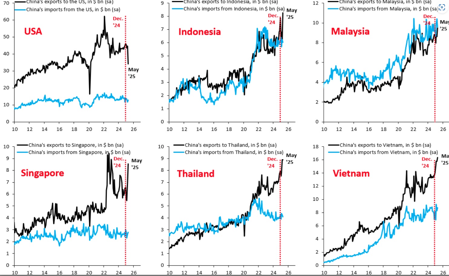 If you stand on a dock in Shenzhen long enough, you can hear the cargo containers whispering, like sirens of the sea. Lately they’re murmuring in French, German and Vietnamese more than English. According to the latest data from China’s General Administration of Customs, China’s exports to the United States fell 9.7% year-over-year in May. But while the U.S. is importing fewer Chinese goods, the European Union is stepping into the breach. Exports from China to the E.U. rose 6.4% year-over-year, driven by machinery, electric vehicles, and green tech components. That EV you see whirring down a Paris boulevard may well have arrived via the Yangtze. This is one short-term outcome of the tariff war. Before Taco Time*, China needed to find other export destinations, as it continued to pursue GDP targets like a hungry dog chases burritos. Europe was a safety valve. At the same time, China is also exporting more to Asia, including to Vietnam. We continue to see analysts claim this is all transshipment but that is not likely. Value is being added in these Asian countries to goods that are than exported. In addition, China is unloading a bunch of cheap goods on these countries, which many of them are complaining about. The big question is will the countries importing more Chinese goods, who are worried about these increases, band together to leverage their collective market power and push back against China? Will even the E.U. do this? The Great Game is afoot.