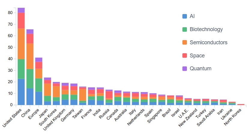 The two T’s of today’s great power games are territory and technology. Russia wants Ukraine and then likely after that the Baltics and perhaps more. China wants Taiwan and the South China Sea. The United States wants, and we can’t believe we are writing this, Greenland and Canada. But girding any territorial ambitions is technology. We see that with battery-powered drones in Ukraine and Russia, for example. So which countries are leading in which technologies? The Harvard Kennedy School created a Critical and Emerging Technology Index to attempt to answer this question. They built it using “public and commercial data” to assess the strengths of 25 countries across “Artificial Intelligence, Biotechnology, Semiconductors, Space, and Quantum.* You can see below the U.S. is the overall leader, followed by China with the E.U. a distant third. China is not far behind in most categories, but the Index asserts that “China has the most immediate opportunity to overtake the United States in biotechnology.” This is likely to be even more the case given the current gutting of the National Institutes of Health. The Index also notes that “no country has complete, end-to-end control of a supply chain for advanced semiconductors.” The semiconductor battle will be fascinating to watch—we are unsure of what strategies make sense in this domain (including export controls and tariffs) and of who will win. In a better world, a diffuse semiconductor industry would be most efficient—no country needs to nor should control the whole supply chain. Alas, we don’t live in that world and so the battle will rage on.