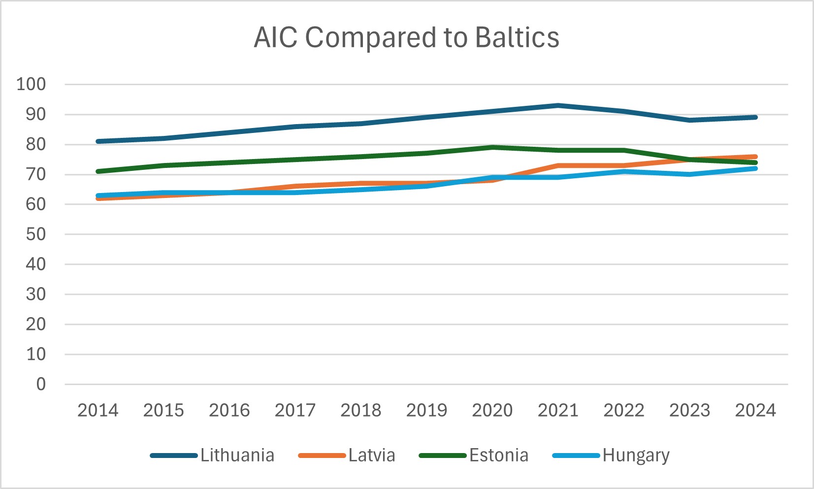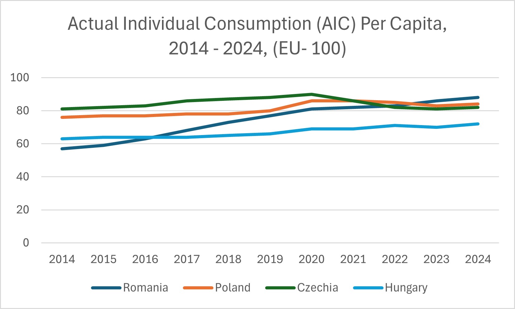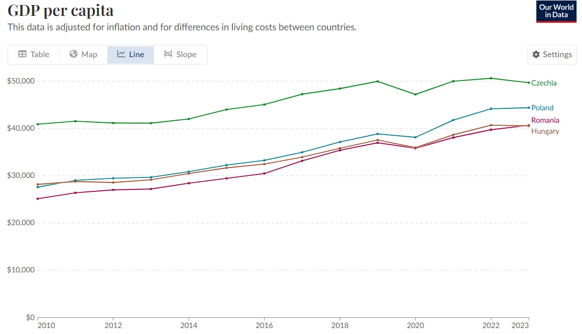 Under Viktor Orbán, Hungary has gone autocracy-light. It is not a full-on dictatorship, but it has taken on the trappings of non-democracies. It still holds elections, but Orban has neutered the media, tilted campaign finance in his party’s favor, and reduced civil liberties, most especially for the LGBTQ community, but also for universities and NGOs. Orban and his friends have also grown rich through corrupt practices. Are Hungarians better or worse for it economically? A professor at the University of California San Diego, Branislav Slantchev, claims Hungary “has dropped to dead last in the European Union (EU) in almost every ranking.” Slantchev provides a chart showing that Hungary is now last in Actual Individual Consumption (AIC) in 2024 in the EU. But to be fair, this should be tracked over time, which we do in the first chart below. When Orban took over, Hungary was already well below Poland and Czechia. On the other hand, Romania passed Hungary. If we do a similar comparison to the Baltic states, Hungary has nearly caught up with Estonia (very surprising to us), but has fallen behind Latvia. Looking at GDP per capita, Hungary has fallen behind Poland and Romania although all three have gained ground on Czechia. So, Hungary has indeed not done well. We’ve pointed to studies multiple times that show democracies outperform autocracies economically, but not by a lot. Democracies should work to do better economically. On the other hand, who wouldn’t rather do slightly better economically and have freedom? Hungary should restore itself to a full democracy. It is not a country to be admired, politically or economically.