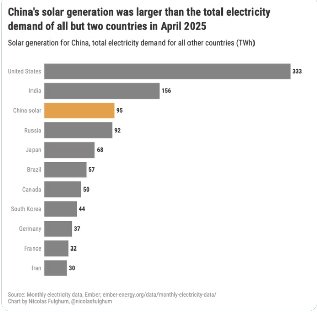 On our walks and bike rides through Seattle we see a smattering of new solar panels installed on the roofs of houses. Even this paltry increase would annoy The New Amish sensibilities of Trump and his anti-progress acolytes. The Trump administration attempts to squash solar power in the United States through the Big Beautiful Bill, although thankfully the Senate has moderated some of the worst anti-solar provisions. Earlier this week Trump said in an interview that solar panels are ugly and we need more coal. Meanwhile, Duncan Campbell reports that “China installed a record 60 GW of new solar photovoltaic capacity in the first quarter of 2025.” And 60 percent of that was rooftop solar. If I rode my bike and walked in China I would see a lot more houses and businesses with solar panels on the roof. Campbell notes further that China understands there is a growing demand for energy and “They know they need more electricity and solar is a fast and low-cost way to do it.” Not only will America fall behind economically because of turning its back on new energy technology that is now cheaper and more efficient than fossil fuels, it will also risk its national security since drones, robots and AI are dependent on abundant energy and batteries. To put China’s lead in perspective, “In April 2025, China’s solar generation of 95 TWh was larger than the TOTAL ELECTRICITY DEMAND of all but two countries in the same month.”