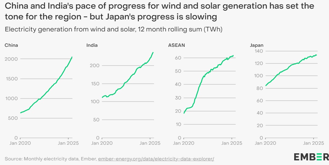 We have friends who are apoplectic about the current U.S. administration’s attempts to squash solar power. We’re concerned, too, but are confident that economics will win out in the United States just as they are in the rest of the world. And they are indeed winning. If you check the latest data, solar power is the fastest growing source for energy generation. As Ember notes, for the last three years solar has been the “largest source of new electricity globally.” In fact, “Solar electricity generation needed just eight years to grow from 100 TWh to 1,000 TWh. Then it took only three more years to double that — reaching 2,000 TWh in 2024.” Just as important in regard to addressing climate change, the growth of solar is happening in large countries who will increasingly use more energy as they continue to develop. As you can see in the second chart below, India and China are increasing electricity generation from solar power at a rapid rate. ASEAN countries, including Vietnam, are not increasing as fast but still the line is up. To quote Ember, “Solar is no longer just a daytime resource. With battery storage costs falling and deployment accelerating, we’re entering a new era where solar can reliably power economies day and night. It’s becoming a true 24-hour solution — clean, scalable, and central to the future of energy transition.” Technology and economics will win out everywhere eventually. Of course, those countries that leverage cheaper, more abundant energy will gain advantages over those that wait.