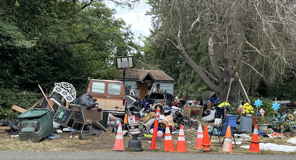 Our wheels wisely turned to a smaller, though much steeper road. We pedaled up it, breathing hard but admiring the wooded shade until we came upon a regal sign set on a lawn in front of a foreboding black iron fence. The gold writing on a purple background read, “Self-Realization Fellowship. Founded 1920 by Paramahansa Yogananda. Seattle Center. All Welcome.” Given the last two words, we came to a stop, and examined the stately building guarded by the black fence and large, locked gate with a prominent “No Trespassing” sign affixed to it. None of it seemed overly welcoming to us, but we know nothing of this religious outfit so rather than judge we pedaled on our self-realization ride and stumbled upon a mansion a block away, but not on a hill, rather, down in a steep gully. It pierced out of it like a wooden tower. it was huge, which we guess is common for mansions, and it was surrounded by tall firs, also emerging from the gully like towering green sentries.