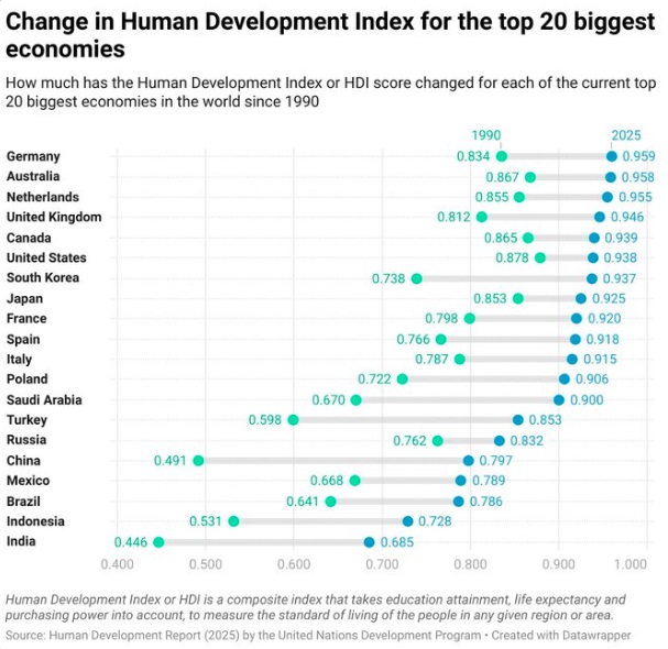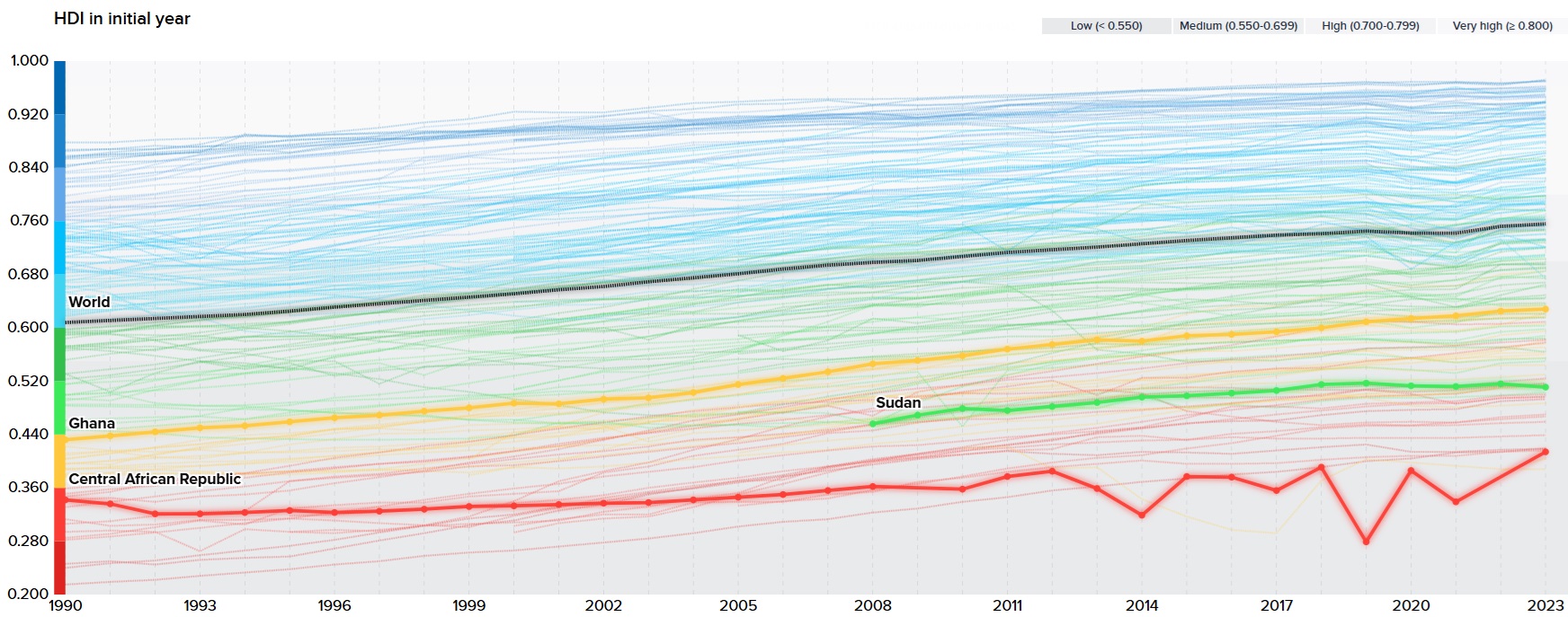 Yes, there are more bad trends in the world than we would prefer, but, as @StatisticUrban points out, most countries have improved their Human Development Index scores over the last 35 years. The Human Development Index is a measure used by the United Nations to assess and compare the overall well-being and development of countries. It was created in 1990. As you can see in the first graph below from @StatisticUrban, all the 20 biggest economies have seen improvements since 1990, especially developing countries. As you can see in the second chart below, nearly every country’s trend is up, most substantially. We highlight two countries which have not fared well, Sudan and the Central African Republic, and compare them to Ghana, which has seen steady progress. Of course, in recent times the international order of the last 30 years has been mauled by the most powerful countries in the world. Everyone hated the international order but they are going to miss it.