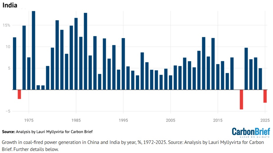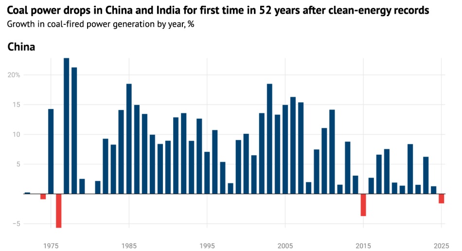To paraphrase the great Ferris Bueller, life moves pretty fast, if you don’t stop and look around at energy generation once in a while, you could miss it. For the first time in 52 years, coal power generation fell in both China and India last year, according to Carbon Brief. This is more evidence of the clean energy revolution. Both countries added record amounts of clean energy in 2025 and will add a lot more this year. The Carbon Brief report states, “generation from coal in India fell by 3.0% year-on-year (57 terawatt hours, TWh) and in China by 1.6% (58TWh).” The last time this happened was in 1973, but that year’s drop was not due to clean energy but because of stagnant economies and the energy crisis. Today, India and China are using more energy which is good for their economies, but reducing usage of coal, which is good for reducing air pollution and addressing climate change. Indeed, Carbon Brief writes, “China achieved this feat even as electricity demand growth remained rapid at 5 percent year-on-year.” India’s electricity demand was stagnant due to mild weather, but the big reason for the fall in India’s use of coal was a record installation of clean energy generation. We’ll be seeing more news like this in the coming months and years as the revolution continues. Oh, and Cameron’s dad’s car will be electric.