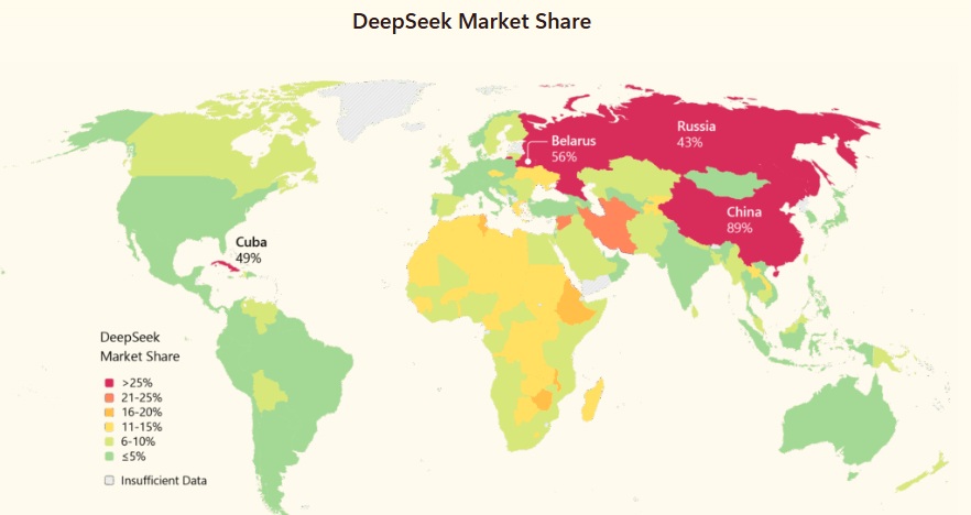 Last year, DeepSeek, the Chinese AI company, shocked the world by releasing an LLM AI model that while perhaps not quite as good as the established front runners, was still pretty darn good. It is difficult to say if it will continue to keep pace in the AI race. There are now other Chinese companies running hard along with the American leaders. Three factors will likely have a say in who wins:* a) export controls; b) developing and fostering talent; and c) building the energy generation necessary for high-level AI. But let’s put all that aside for a moment and ask a different question: how much is DeepSeek’s model being used in the world? Microsoft, which has a stake in this AI game, recently released a report that shows usage of DeepSeek spreading rapidly. As you can see in Microsoft’s graphic below, unsurprisingly DeepSeek’s greatest success is in China, Russia and Belarus. But it’s also gaining in markets that, as Microsoft says, “are underserved by Western AI platforms.” This includes much of Africa. “In Africa in particular, DeepSeek usage is estimated to be 2 to 4 times higher than in other regions.” The reason for success in Africa and other such markets? Cost. “DeepSeek’s free service eliminated the cost barriers (requiring credit cards or paid upgrades) associated with Western models. In addition, Chinese technology companies, including DeepSeek and infrastructure partners like Huawei, actively promoted and deployed the platform in African markets through partnerships, outreach, and integration with telecom services.” And, to be fair, Chinese government subsidies. The Great Race is on.