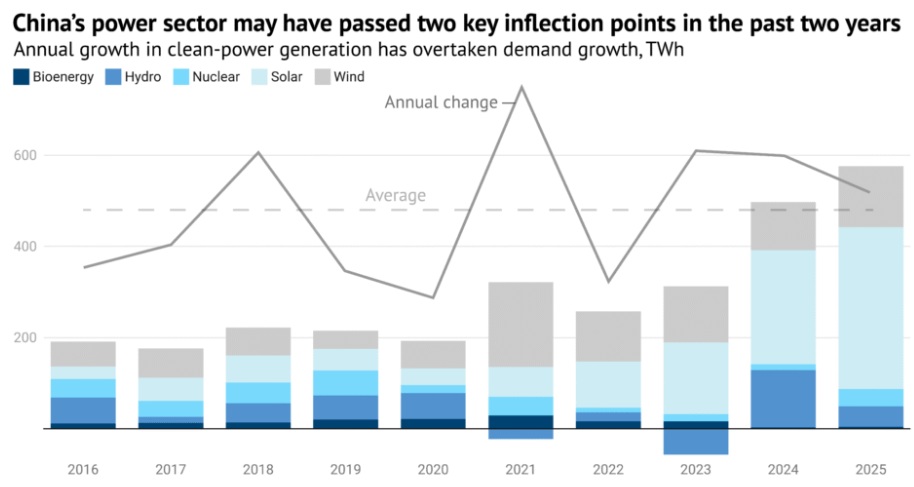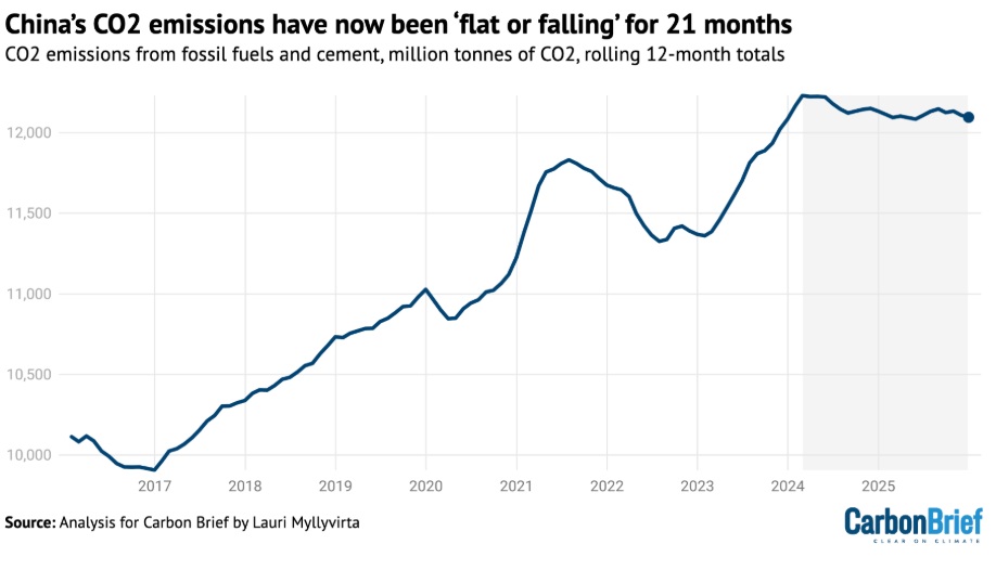 Almost a year ago, we pointed to Carbon Brief data showing that China CO2 emissions were down 1.6 percent year over year and wondered whether China’s CO2 emissions had peaked. Returning to Carbon Brief, like a moth to a solar-powered flame, this week they write, “The latest analysis shows China’s CO2 emissions have now been flat or falling for 21 months, starting in March 2024. This trend continued in the final quarter of 2025, when emissions fell by 1% year-on-year.” In fact, emissions have been falling in Chinese industry with the exception of the chemical industry. China has been installing large amounts of solar, wind and nuclear energy. As a result, even though electricity demand is growing rapidly, emissions are not. This is all good news for addressing climate change. But while China does care about the environment, the main driving factor for installing clean energy capacity is the desire to remain dominant in industry. Drones are flying batteries, EVs are driving batteries. AI, which China also wants to be dominant in, has large energy needs. As it turns out solar, wind and batteries are the most cost-efficient means of adding electricity capacity. Countries should learn from that.
