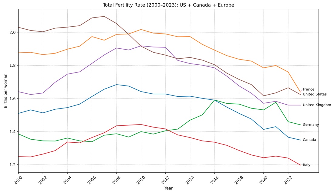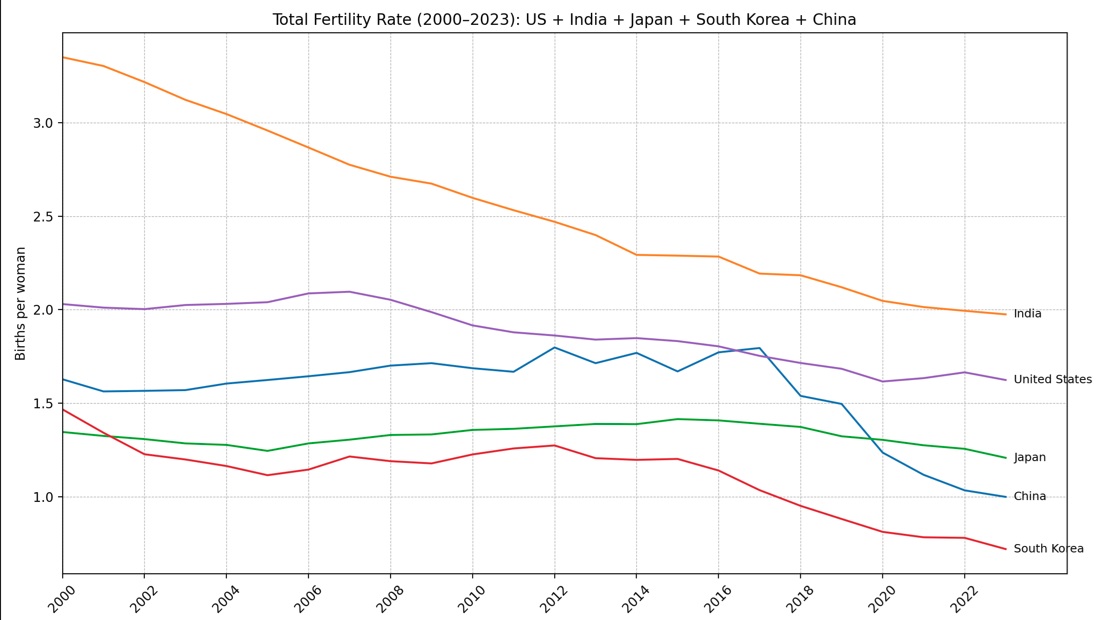 We all know that fertility rates are falling everywhere. In fact, just about every country outside of Africa and India has below replacement level fertility rates. And even their rates are falling. Jeremy Horpedahl, an economist at the University of Central Arkansas (Go Sugar Bears!*),  notes that the United States has one of the highest fertility rates among high income countries, what he calls its peer countries. That got us to wonder how the 10 largest economies’ fertility rates are faring. The United States also ranks well among these countries, trailing only behind France and India. As you can see in the first chart below, the UK, Germany, Canada and Italy’s fertility rates are all well below the U.S. The other four largest economies are all located in Asia. The second chart shows Japan, China and South Korea’s fertility rates are all well below the United States. Indonesia is not one of the ten-largest economies but It’s the fourth most populous country in the world and its economy has been doing pretty well…and its fertility rate is above replacement level, barely. If I’m looking to the future, I’d bet on India and Indonesia…and the United States, if it can get its act together. Most countries will face challenging demographics in the coming years, including and especially the largest economies.