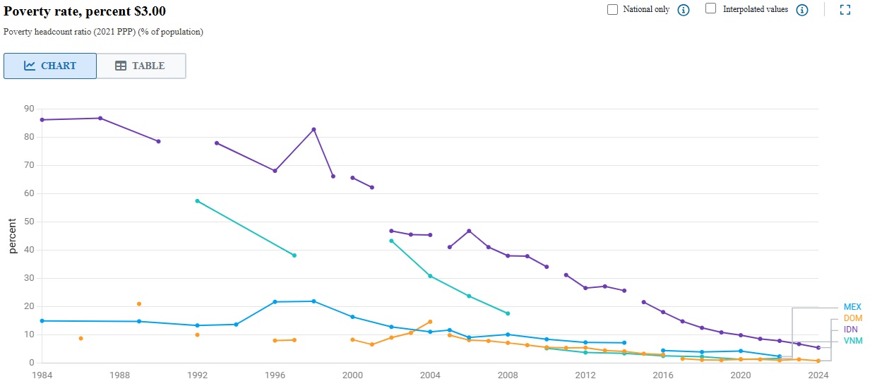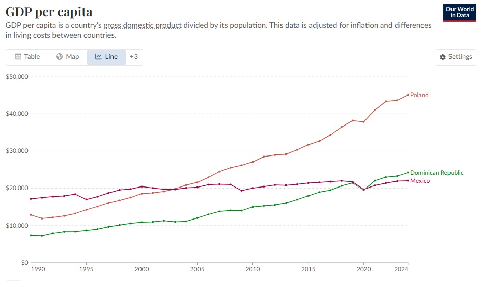 Mexico’s government has trumpeted the fact that for the first time there are more middle-class Mexicans than those living in poverty. World Bank data shows that Mexico’s middle class has grown by 12 percent since 2018. Of course, like any government, Mexico points to its policies for this success. And perhaps they should be congratulated. But overall Mexico could and should do better at reducing poverty. As the same World Bank report points out, Latin American countries, including Mexico, “lag behind their counterparts in more dynamic upper middle-income regions in long-term poverty reduction and economic growth.”  Indeed, if we look at some other upper middle income countries, many have done much better than Mexico in reducing poverty, including Vietnam and Indonesia in Southeast Asia and closer to home the Dominican Republic (see first chart below). Or look at GDP per capita (second chart below). Starting from a much lower level, the Dominican Republic passed Mexico in 2021. And look at Poland, which after the fall of the Soviet Union has far outpaced Mexico in economic growth and thus in poverty reduction. Mexico needs to grow its economy at a faster rate—that will reduce poverty far more quickly and permanently.