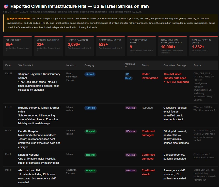 The World Health Organization has identified 13 Iranian health infrastructure sites hit during the war. Even water desalinization sites have apparently been targeted and destroyed. Poland’s Centre for Eastern Studies assessed that Israel is not interested in a successful political transformation of Iran, but rather the opposite — its “profound weakening, and potentially even its disintegration, for example along ethnic lines.” Late Monday, Trump posted to social media in response to Iranian threats to close the Strait of Hormuz, “Additionally, we will take out easily destroyable targets that will make it virtually impossible for Iran to ever be built back, as a Nation, again – Death, Fire and Fury will reign upon them—But I hope, and pray, that it does not happen.” Essentially, Trump is threatening to commit war crimes. In addition to the dubious morality of destroying the land of 2.1 million Palestinians, we question whether that will really make Israel safe for the long term. Iran, unlike Gaza, is giant geographically and home to 91 million people. Believing that Iran’s destruction, with potential for civil war, will keep one safe is, well, madness.