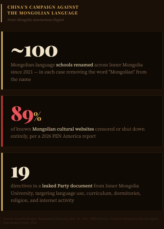We often hear about China’s suppression of minority cultures in broad strokes. A leaked internal document from Inner Mongolia University shows us the bureaucratic machinery up close. Soyonbo Borjgin, a Southern Mongolian journalist now based in New York who writes the Substack Reeducated, obtained and published a 16-page internal Party directive dated December 31, 2021, stamped “Internal Document — Strictly Prohibited from External Distribution.” In 19 numbered directives, it instructs how to systematically remove the Mongolian language from, as Borjgin writes, “one of the most important centers of Mongolian scholarship in the world.” The directives cover nearly every domain of university life. Item 7 mandates that homework, thesis proposals, lab records, degree theses, exam questions, and research applications all be conducted in Mandarin — effectively ending scholarly production in Mongolian at the university’s own School of Mongolian Studies. Item 8 orders that campus signage and plaques conform as well, and that anything failing to comply “must be corrected.” Even Genghis Khan is not spared. A statue of the conqueror on campus, which bore his name in traditional Mongolian script for decades, had that inscription removed in 2022. This was not an isolated directive. It followed the September 2020 order replacing Mongolian instruction with Mandarin textbooks, which triggered the largest regional protests in decades. The authorities crushed the movement through surveillance and arrest. Document No. 43 translated that campaign into enforceable institutional orders, with every administrator’s promotion tied to compliance. How to erase a language in 19 steps.