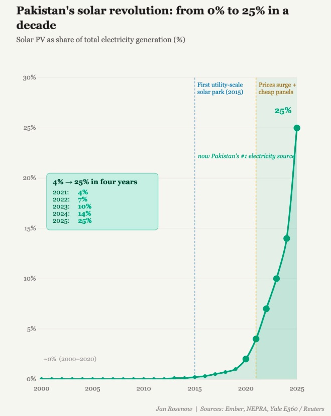 As we’ve chronicled, including this week above, there are many negative second-order effects from the U.S.-Israel war against Iran. But even in the most foolish escapades, there are silver linings, and that is true with this war as well. The spike in oil prices will impel countries to accelerate their installation of solar power. This was going to happen anyway as solar became competitive with and often cheaper than fossil fuels for generating energy, powering vehicles and for other applications, but the increase in the price of oil and instability of oil markets wrought by this war is a kick in the wallet to move even faster. Pakistan, which has tried to broker a peace deal, has seen solar’s share of electricity generation increase from four percent five years ago to 25 percent today. That wasn’t driven by government policy or concern about climate change, it was driven by Pakistan’s inefficient and bureaucratic electricity grid. Pakistani consumers have agency and they began installing rooftop solar. The world will be doing even more of that in the coming years. Consumers around the globe will buy electric vehicles to protect themselves from gas prices, install solar panels and generally turn away from fossil fuels. In the short term, unfortunately, in the face of crisis, some countries will burn more coal. But in the mid-to-long term, this war will accelerate the solar revolution.