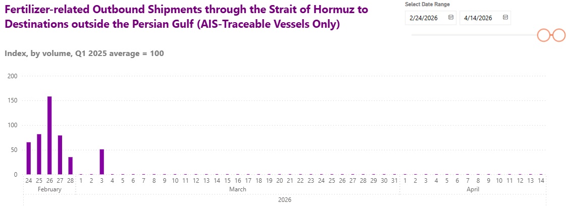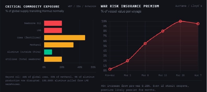 Don’t catastrophize, any decent therapist tells you. But we have been watching the data coming out of the Strait of Hormuz with increasing unease, and some serious analysts are now saying what the numbers are already suggesting: the global economy may be about to experience something worse than a price shock. University of Chicago political science professor Robert Pape, who studies economic sanctions and blockades, posted last week that we have crossed from step one—price spike—into step two: physical shortage. He asserts we go from “price spike → physical shortage → economic contraction.” Pape is not alone. The World Economic Forum, the International Energy Agency, the Institute for Supply Management, and logistics analysts at various companies are all tracking data that supports Pape’s framework. So, what does the data actually show? We know vessel traffic has collapsed since the beginning of the war. Brent crude hit $103.72 earlier this week — up 57 percent year over year — after peace talks collapsed and the U.S. announced a naval blockade of Iranian ports. Jet fuel has more than doubled, from $95 to $197 per barrel since February. War-risk insurance premiums have gone from 0.25 percent to 10 percent of vessel value per voyage — a 40-fold increase. And the disruption extends well beyond oil: 46 percent of global urea exports and a third of seaborne methanol normally transit Hormuz. As we’ve written about, fuel shortages are already being reported in parts of South Asia and Europe. Keep an eye on the Strait of Hormuz Tracker we posted last week. And watch the price of Brent crude, container spot rates on Asia-Europe lanes, and global urea prices (you know you’ve always wanted to track urea). If transits don’t recover meaningfully, Pape’s step three is not a prediction. It’s a schedule. We assume Trump wants to a) avoid economic disaster; and b) put all this behind him before his May 2 China visit. Will he be able to?