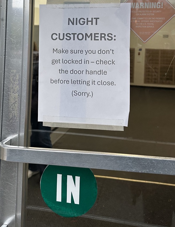 This, as you might expect, led to lots of questions on our part and not a little bit of speculation. This being the post office, we had plenty of time to speculate while we waited in the longish line. When our turn came, we couldn’t help ourselves and asked the postal worker about the sign. He said they had been having problems with the door lock for weeks and weeks. We asked if someone had actually locked themselves in the lobby. He answered yes. We can neither confirm nor deny whether we laughed, though we can confirm an eyebrow was raised by the postal worker at our response. We asked whether the poor schmuck was stuck inside all night or somehow broke their way out. He said no, the trapped soul called the fire department and was rescued forthwith.