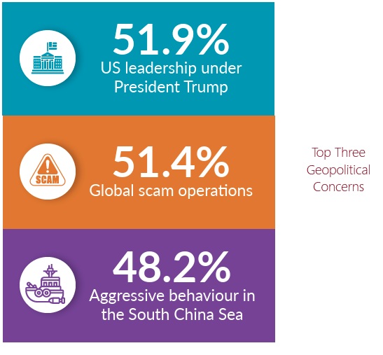 You may have noticed a lot has been happening in the world over the last year. What do people think about it? Thanks to the Yusof Ishak Institute in Singapore, we can learn what folks in Southeast Asia think, or at least its elite. The Institute conducts an annual survey of opinion leaders of the region across a variety of international issues. It’s worth noting the respondents are comprised more of professionals than those who are poor (CNN is one of the respondents’ top sources of news). Still the results are enlightening. The top three geopolitical concerns, as you can see in the Institute’s graphic below are a) U.S. leadership under President Trump; b) global scam operations; c) aggressive behavior in the South China Sea. Pretty impressive that Trump can make China’s aggressive actions against these countries play second fiddle. Perhaps because of this, “a slim majority of ASEAN respondents selected China (52.0%) over the US (48.0%) if the region were forced to align itself with one of the two strategic rivals.” Also interesting is that Japan is “the most trusted power in the region (65.6%), with a significant share of the respondents (41.4%) viewing it as a responsible stakeholder that respects and champions international law.” The world is changing and the views and actions of countries are too.